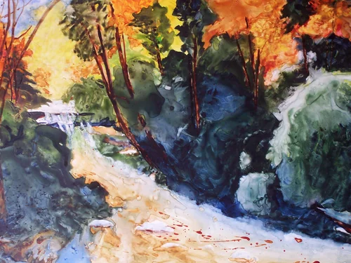 Falling Stream in Autumn 15 x 22 in. Watercolor on Yupo