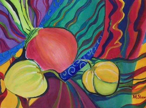 For example, Piece Making emerged from an attempt to represent the complexity and creativity in modern quilt-making as demonstrated by an accomplished quilter friend. On the other hand, Red Onion and Tomatillos came about from a still life of two vegetables used in Tex-Mex foods favored by my Texas-born husband.